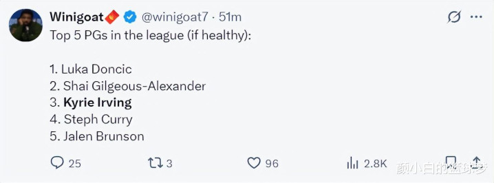 美媒Winigoat写道,假如球员们都完全健康,那么前五控卫应该是:东契奇、亚历山大、欧文、库里、布伦森。