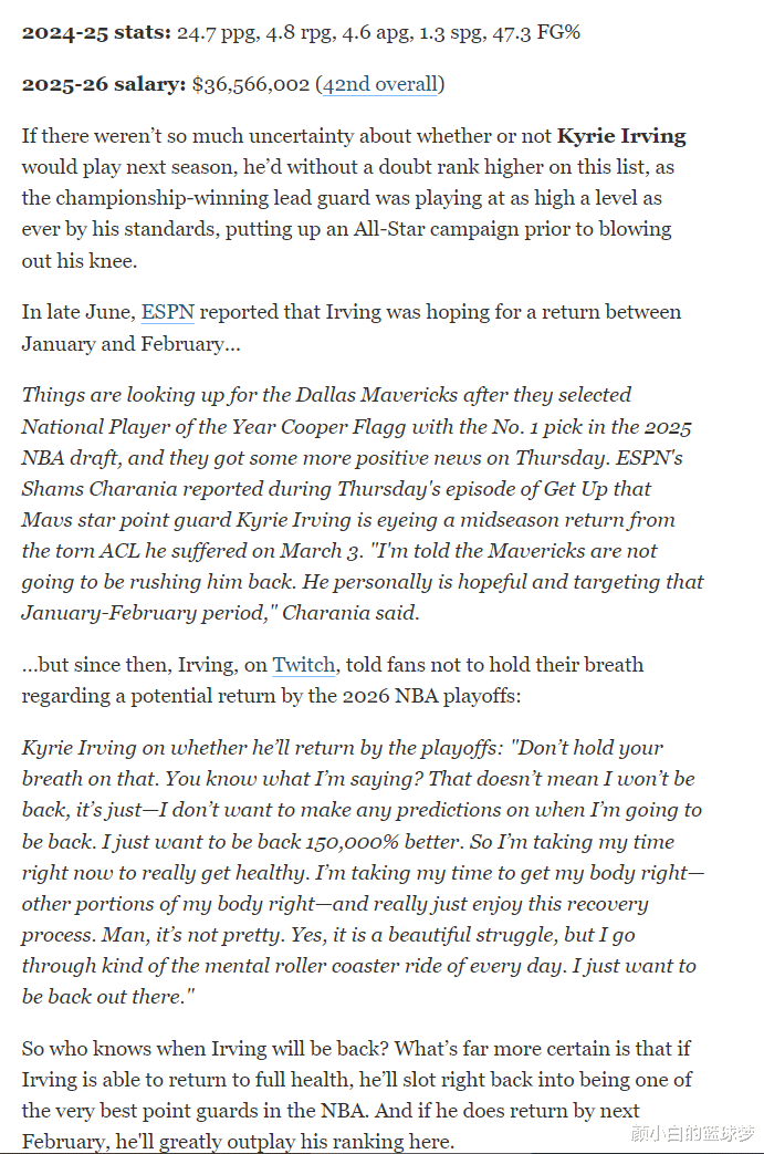 欧文仅仅排在第19位,原因HoopsHype也写的很清楚——ACL大伤(前交叉韧带撕裂),欧文自认为能在1月或2月复出,但达拉斯并没有催促他过早复出,希望欧文完全康复后再回归。